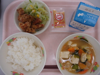 米飯♪若鶏の竜田揚げ♪ゆで野菜♪味噌汁♪牛乳♪エネルギー786kcal、たんぱく質27.4g、脂質27.4g
