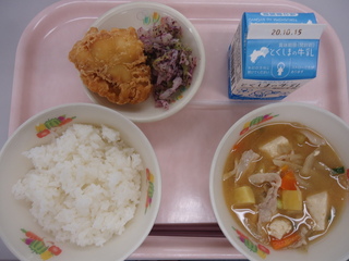 米飯♪はもの天ぷら♪キャベツのゆかり和え♪さつま汁♪牛乳♪エネルギー730kcal、たんぱく質30.9g、脂質19.9g