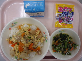 親子丼(米飯)♪ごまあえ♪さつまいもスティック♪牛乳♪エネルギー700kcal、たんぱく質28.1g、脂質21.1g