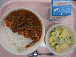ハヤシライス(米飯)♪さつまいものサラダ♪牛乳♪エネルギー697kcal、たんぱく質24.0g、脂質18.5g