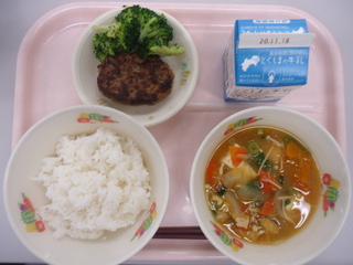 米飯♪和風ハンバーグ♪ゆでブロッコリー♪味噌汁♪牛乳♪エネルギー668kcal、たんぱく質32.9g、脂質16.1g