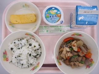 わかめご飯♪筑前煮♪厚焼きたまご♪すだちゼリー♪牛乳♪エネルギー685kcal、たんぱく質26.7g、脂質18.3g