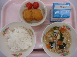 米飯♪はもの唐揚げ♪ミニトマト♪ふしめん汁♪牛乳♪エネルギー678kcal、たんぱく質26.9g、脂質17.0g