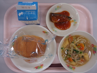 小型パン♪りんごジャム♪牛乳♪味噌ラーメン♪いわしのトマト煮♪エネルギー737kcal、たんぱく質33.8g、脂質20.0g