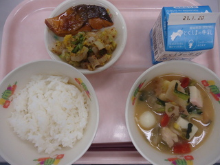 米飯♪ぶりの照り焼き♪おひたし♪雑煮♪牛乳♪エネルギー774kcal、たんぱく質27.6g、脂質17.0g