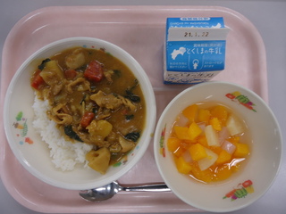 冬カレーライス♪ナタデココ入りフルーツポンチ♪牛乳♪エネルギー766kcal、たんぱく質22.8g、脂質18.1g