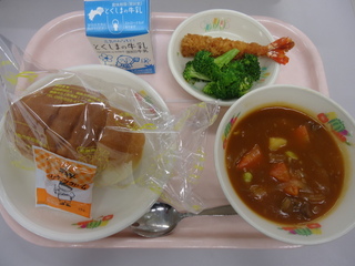 パン♪ピーナッツクリーム♪えびフライ♪ゆでブロッコリー♪ビーフシチュー♪牛乳♪エネルギー821kcal、たんぱく質34.2g、脂質32.5g