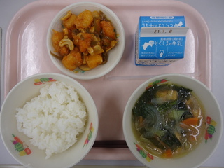 米飯♪牛乳♪えびとカシューナッツの炒め物♪中華スープ♪エネルギー683kcal、たんぱく質27.5g、脂質18.5g
