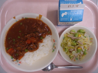 ハヤシライス(米飯)♪れんこんサラダ♪牛乳♪エネルギー684kcal、たんぱく質27.0g、脂質20.8g