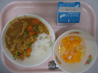 カレーライス(米飯)♪ナタデココ入りフルーツポンチ♪牛乳♪エネルギー795kcal、たんぱく質22.9g、脂質19.8g