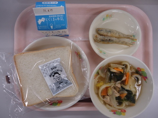食パン♪黒豆きなこクリーム♪根菜うどん♪小いわしのフライ♪牛乳♪エネルギー838kcal、たんぱく質30.3g、脂質25.1g