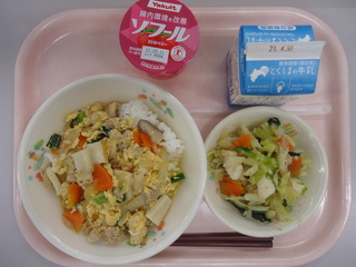 親子丼(米飯)♪ちぐさあえ♪いちごヨーグルト♪エネルギー769kcal、たんぱく質29.2g、脂質20.8g