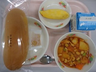 パン♪りんごジャム♪ポークビーンズ♪ミートキャロットオムレツ♪牛乳♪エネルギー734kcal、たんぱく質31.1g、脂質23.7g