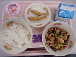 米飯♪ゆかりふりかけ♪大豆とひじきの煮物♪わかさぎのフリッター♪さくらんぼゼリー♪牛乳♪エネルギー726kcal、たんぱく質28.2g、脂質21.6g