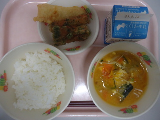 米飯♪いかの天ぷら♪ちくわの磯辺揚げ♪味噌汁♪牛乳♪エネルギー814kcal、たんぱく質32.5g、脂質25.4g