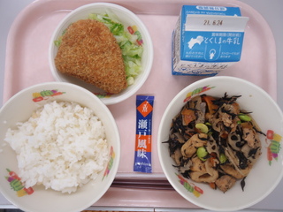 玄米ご飯♪瀬戸ふりかけ♪ひじきの炒め煮♪かぼちゃサンドフライ♪ゆでキャベツ♪牛乳♪エネルギー788kcal、たんぱく質26.5g、脂質26.5g