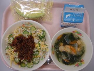 ビビンバ♪わかめスープ♪メロン♪牛乳♪エネルギー706kcal、たんぱく質31.1g、脂質19.5g
