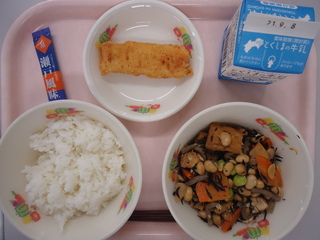 米飯♪瀬戸ふりかけ♪大豆とひじきの煮物♪いかの天ぷら♪牛乳♪エネルギー731kcal、たんぱく質30.8g、脂質22.8g