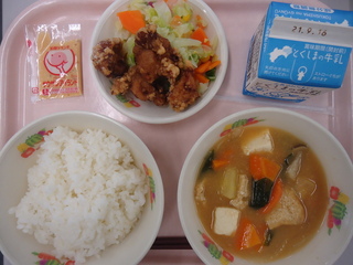 米飯♪若鶏の竜田揚げ♪ゆで野菜♪サウザンアイランドドレッシング♪味噌汁♪エネルギー790kcal、たんぱく質27.5g、脂質27.4g