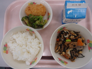 米飯♪ひじきの炒め煮♪えびカツ♪ブロッコリーのおかかあえ♪牛乳♪エネルギー690kcal、たんぱく質31.1g、脂質18.9g