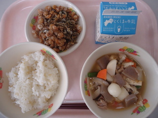 玄米ご飯♪いもたき♪大豆とちりめんの揚げ煮♪牛乳♪エネルギー704kcal、タンパク質26.2g、脂質18.8g