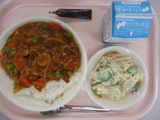 ハヤシライス♪マカロニサラダ♪牛乳♪ミルメークコーヒー♪エネルギー709kcal、タンパク質26.2g、脂質22.6g