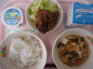 米飯♪豚肉のごまがらめ♪ゆでキャベツ♪味噌汁♪すだちゼリー♪牛乳♪エネルギー748kcal、タンパク質33.2g、脂質19.9g