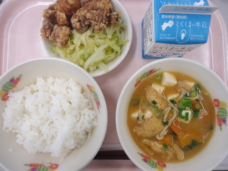 米飯♪若鶏の竜田揚げ♪ゆでキャベツ♪味噌汁♪エネルギー699kcal、タンパク質27.9g、脂質24.3g