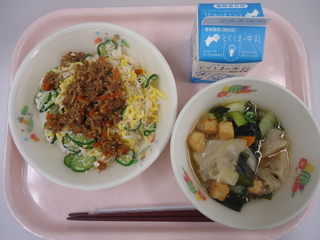 ビビンバ(米飯)♪ワンタンスープ♪牛乳♪エネルギー700kcal、タンパク質30.3g、脂質22.1g
