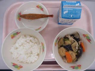 米飯♪なすと豚肉の味噌炒め♪子持ちししゃもフライ♪牛乳♪エネルギー688kcal、タンパク質27.0g、脂質22.7g