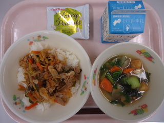 キムチ丼(米飯)♪チンゲンサイのスープ♪ハニーピーナッツ♪牛乳♪エネルギー703kcal、タンパク質29.1g、脂質23.0g