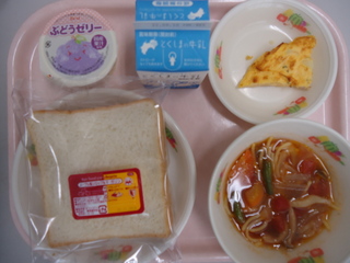 食パン♪オープンオムレツ♪ミネストローネスパゲティ♪牛乳♪エネルギー702kcal、タンパク質23.3g、脂質29.0g