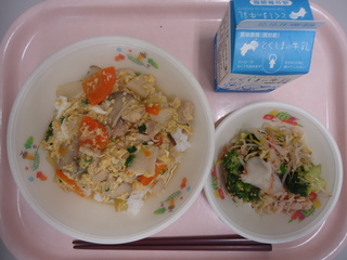 親子丼♪酢の物♪牛乳♪エネルギー669kcal、タンパク質30.0g、脂質20.7g