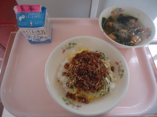 ビビンバ(米飯)♪わかめスープ♪牛乳♪エネルギー670kcal、タンパク質30.7g、脂質20.2g