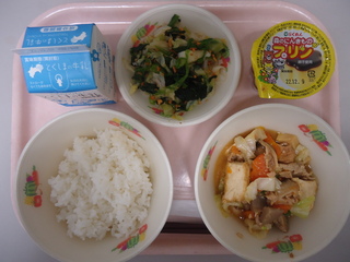 米飯♪厚揚げと豚肉のみそ煮♪ピーナッツ和え♪プリン♪牛乳♪エネルギー712kcal、タンパク質28.9g、脂質21.2g