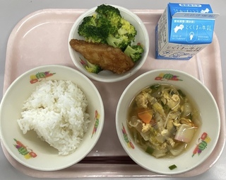 米飯♪メルルーサのすだち風味♪ゆでブロッコリー♪かきたま汁♪牛乳♪エネルギー646kcal、タンパク質28.0g、脂質17.2g