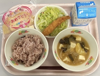 赤飯♪ごま塩♪エビフライ♪ゆでキャベツ♪タルタルソース♪味噌汁♪お祝いクレープ♪牛乳♪エネルギー756kcal、タンパク質24.5g、脂質24.5g