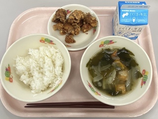 米飯♪若どりのから揚げ♪わかめスープ♪牛乳♪エネルギー678kcal、タンパク質25.4g、脂質24.8g