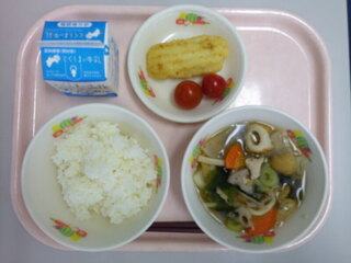 ごはん♪いかの天ぷら♪ミニトマト♪根菜うどん♪牛乳♪