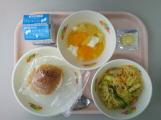 ロールパン♪焼きビーフン♪杏仁入りフルーツポンチ♪チーズ♪牛乳♪