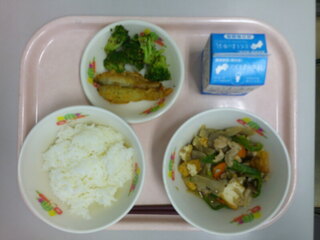 ごはん♪豚肉とこんにゃくの味噌炒め♪わかさぎのフリッター♪ブロッコリーのごま和え♪牛乳♪