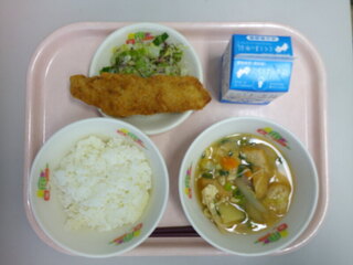 ごはん♪かますフライ♪キャベツのゆかり和え♪じゃがいもの味噌汁♪牛乳♪