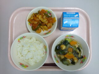 ごはん♪えびとカシューナッツの炒め物♪中華スープ♪牛乳♪
