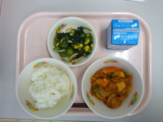 ごはん♪鶏肉とさつまいものケチャップ和え♪海そうサラダ♪牛乳♪