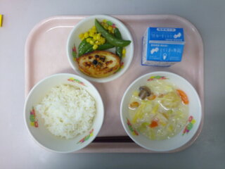 ごはん♪かぼちゃグラタン♪スナップえんどうの炒め煮♪チャウダースープ♪牛乳♪