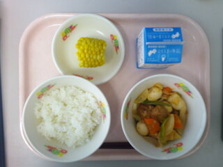 ごはん♪肉団子の酢豚風♪ゆでとうもろこし♪牛乳♪
