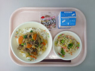 牛丼(玄米ごはん)♪酢の物♪小魚アーモンド♪牛乳♪
