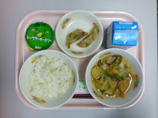 玄米ごはん♪ほいこうろう♪ひじき入りぎょうざ♪シークワーサーゼリー♪牛乳♪