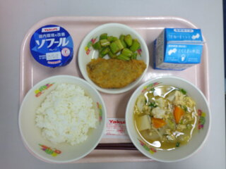 ごはん♪ぼうぜフライ♪アスパラのごまじょうゆ和え♪かきたま汁♪牛乳♪