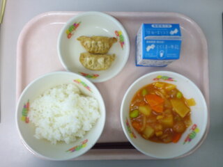 ごはん♪えびとポテトのチリソース煮♪ぎょうざ♪牛乳♪